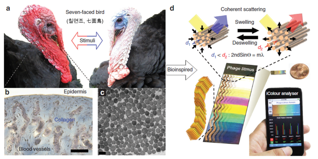 Biomimetic M13 phage-based colorimetric sensors. (a) Color changes of turkey skin when they get flustered; (b,c) Structural characterizations of turkey skin; (d) Bioinspired M13 phage arrays for colorimetric sensing. (Reprinted with permission from [], published by Nature Publishing Group, 2014).