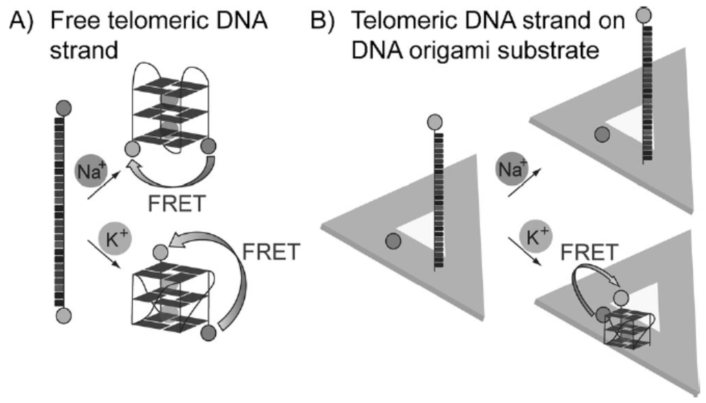 Selective detection of K+ with telomeric DNA strand and DNA origami.(A) Free telomeric DNA strand; (B) Telomeric DNA strand on DNA origami substrate (Reprinted with permission from [], published by WILEY-VCH Verlag GmbH & Co., 2014).