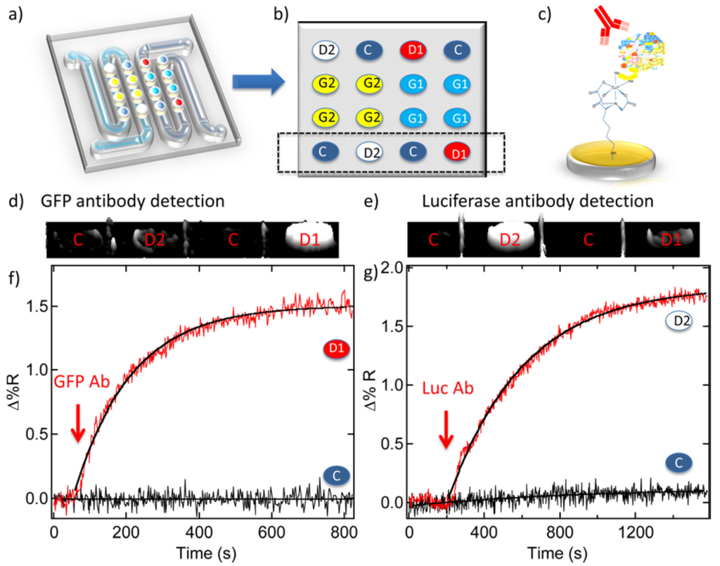 Recently, Seefeld et al. reported a very interesting work on the biosensing of antibody by using the developed SPR imaging technique []. In their work, they utilized a generator with DNA microarrays to on-chip synthesis of protein microarrays on the detector. The single stranded mRNA molecules are transcribed from the surface-bound dsDNA on the generator and the translated protein molecules are captured by the detector for the SPR imaging biosensing. Figure 5 shows the application of the synthesized green fluorescent protein (GFP)-luciferase protein microarrays for the detection of the anti-GFP and anti-luciferase antibodies. They used a five-component, 16-element DNA microarray chip (Figure 5a) to synthesize protein microarray for biosensing, in which five components are labelled as 4 GFP generator elements (G1), 4 luciferase generator elements (G2), 2 GFP detector elements (D1), 2 luciferase detector elements (D2), and 4 control elements (C), respectively, as shown in Figure 5b. The fabricated microarray was then applied for the SPR imaging antibody biosensing (Figure 5c). The SPR imaging difference images taken before and after the incubation in anti-GFP and anti-luciferase solutions (50 nM and 100 nM, respectively) indicated that the adsorption of antibodies can be clearly observed in these images as the detector D1 and D2 show significant signals (Figure 5d,e). The corresponding real-time SPR imaging adsorption kinetics measurements further identify the strong adsorption of anti-GFP and anti-luciferase towards the relative detectors (Figure 5f,g). This novel and convenient strategy for the fabrication of the DNA-based on-chip protein microarray will have potential applications for the multiple biosensing in clinical and research fields.