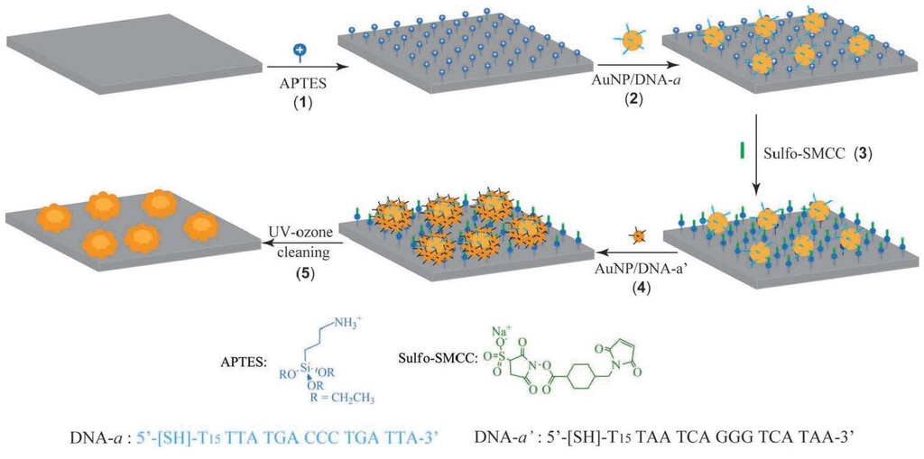 SERS has been shown to be a useful tool for the detection of low-concentration analytes, sometimes even achieving single-molecule sensitivity. One of the important fields of SERS study is how to prepare SERS-active substrates that can provide great sensitivity and good reproducibility. Biomolecule-based metal nanostructures are the excellent substrates for the SERS detection. We have made the first explorations by applying the 2D DNA network decorated with silver NPs for the highly sensitive SERS detection of R6G and 4-aminothiophenol []. We found that the DNA network provides an excellent porous template for the self-assembly of silver NPs to form SERS-active substrate with high activity and signal-to-noise. In another study, we fabricated a highly active SERS substrate by using the layer-by-layer assembly of λ-DNA networks and positive charged silver NPs []. Recently, Zheng and co-workers reported a very interesting work on the DNA-directed self-assembly of core-satellite plasmonic nanostructures for the highly sensitive and reproducible near-IR SERS sensor []. Figure 6 shows the schematic preparation of the hierarchical self-assembled core-satellite plasmonic nanostructures. Firstly, a glass substrate was modified with 3-aminopropyltriethoxysilane (APTES), and then the negative charged 30 nm gold-DNA NPs can electrostatic immobilized onto the APTES-modified glass. After neutralizing the surface-confined amino groups by the formation of covalent amide bonds with sulfosuccinimidyl-4-[N-maleimidomethyl]cyclohexane-1-carboxylate (sulfo-SMCC), another 20 nm gold-DNA NPs (with complimentary ssDNA) can be conjugated onto the 30 nm gold NPs by DNA hybridization. Finally, the surface-confined molecules were removed through UV-ozone cleaning to yield SERS-active surface. This near-IR SERS substrate is highly active and the detection limit is down to single molecular level. In addition, this strategy for creating SERS substrate is relative economic. As for the DNA-based nanostructures for SERS applications, it is recommended to study the previous review paper by Sun et al. [].