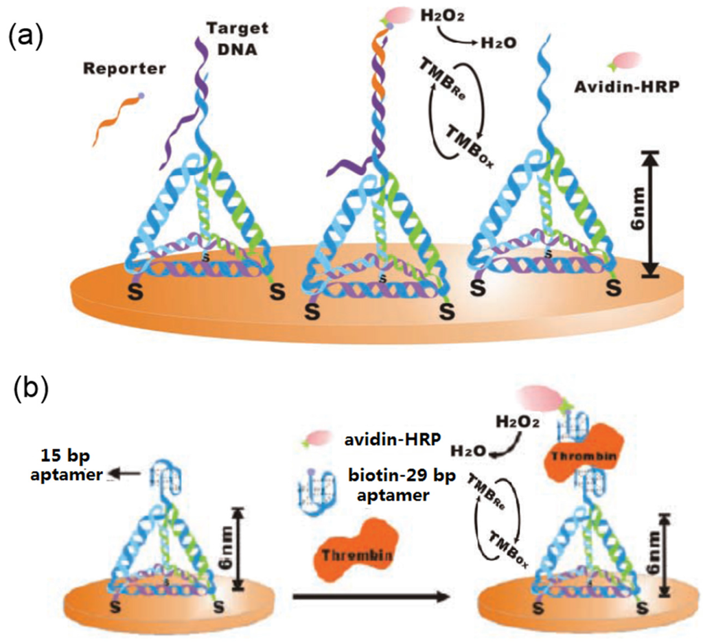 3D tetrahedral DNA nanostructures for EC biosensing of (a) DNA and (b) thrombin (Reprinted with permission from [], published by WILEY-VCH Verlag GmbH & Co., 2010).