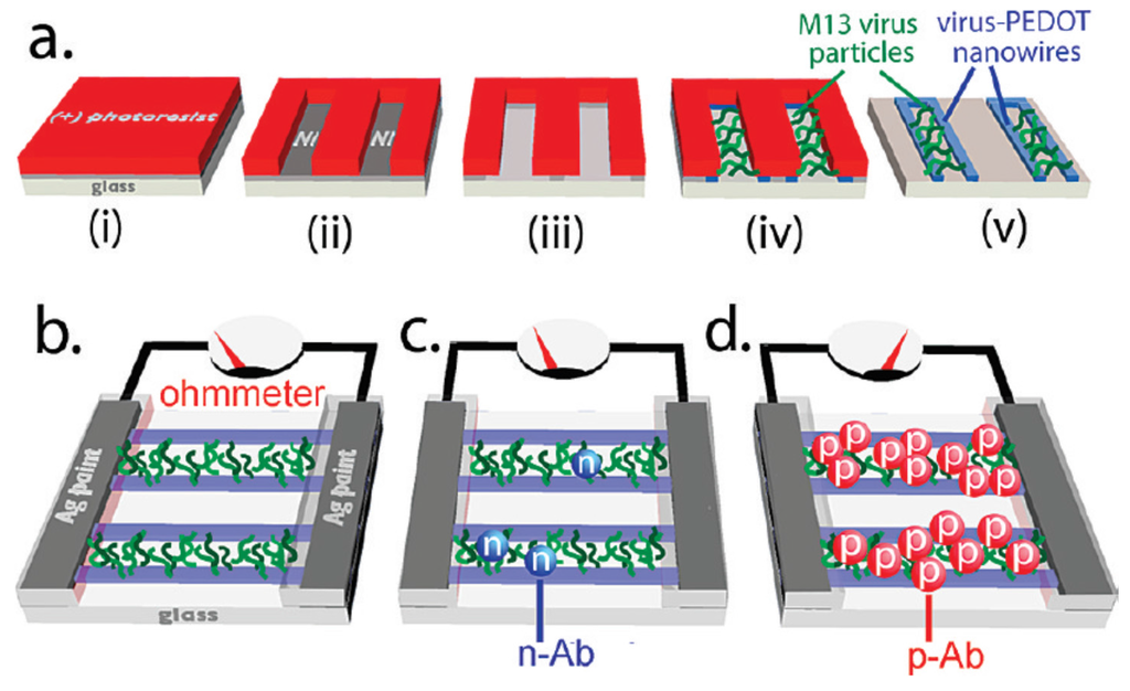 Virus-templated nanowires based electrical biosensor: (a) schematic preparation of virus-polymer nanowires; (b) detection mechanism of electrical biosensors; and (c,d) detection of antibodies (Reprinted with permission from [], published by American Chemical Society, 2010).
