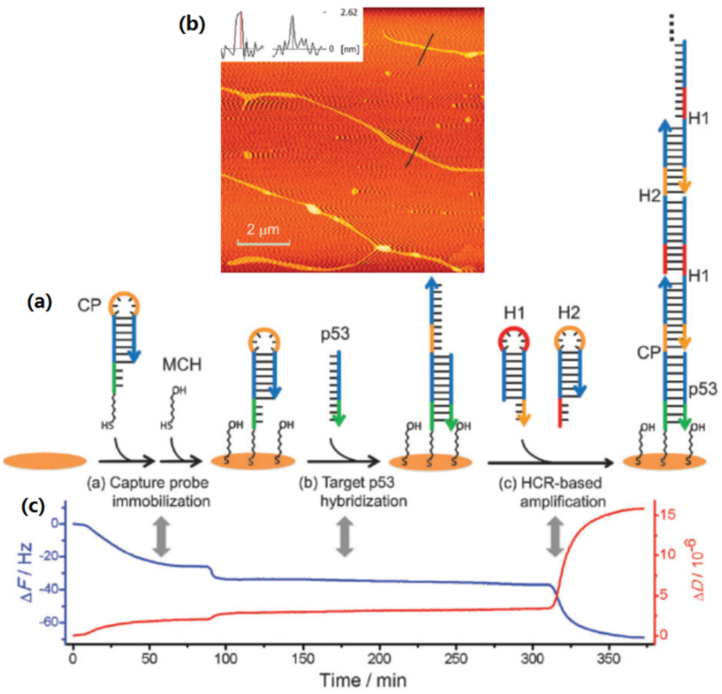 DNA-based nanostructures are the potential and efficient signal amplifiers for the QCM biosensing platform. Previously, Tang et al. demonstrated a self-assembled DNA nanostructure-amplified QCM with dissipation biosensing platform for the detection of nucleic acids [], as shown in Figure 9. Figure 9a presents the fabrication and sensing mechanism of the self-assembled DNA nanostructure-based QCM sensor. Firstly, the capture probe (CP) and mercaptohexanol molecule (MCH) were immobilized on the gold chip (step a). The sequence of CP was designed precisely so that the initiator domain was protected by hairpin initially. Secondly, the target p53 was injected into the system for DNA hybridization (step b), which unfolded the closed CP hairpin structure to free the initiator domain. In this process, the low mass of target p53 is not enough for creating the clear frequency change, and therefore a signal amplification strategy is necessary. After that, two addition hairpins, H1 and H2, were designed and added into the chip to facilitate cross-hybridization on the free initiator domain (step c). Finally, the exposed initiator domain of CP triggered the hybridization chain reaction by the two hairpins into a 1D helix DNA nanostructure. The polymerized 1D helix DNA structure was measured with atomic force microscopy (AFM), and the typical height image is shown in Figure 9b. The corresponding QCM response curves (Figure 9c) in every steps of Figure 9a indicate that the formation of self-assembled DNA 1D nanostructure can greatly enhance the detection signals of p53 target. A detection limit of 0.1 nm for p53 was obtained. In another similar study, Altintas et al. developed a DNA-based QCM biosensor system for the detection of one-point mutation in TP53 gene []. A highly specific and sensitive hybridization reaction was successfully achieved in the concentration range of 0.03–2 µM detection probe with a rapid and real-time measurement.