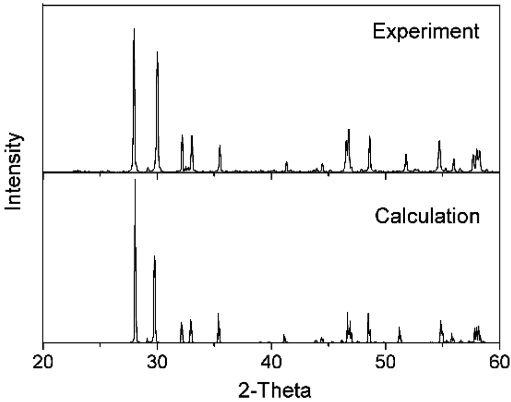 Figure 1 shows the XRD pattern of the sample calcined at 1400 °C. All of the peaks match those of the SmTaO4 phase. The SmTaO4 crystal structure belongs to the monoclinic system, and the coincident space group is I2/a. The Sm3+ ion is surrounded by eight oxygen neighbors to form a dodecahedron and is located at the sites with C2 symmetry; moreover, the Ta5+ ion is surrounded by six oxygen neighbors to form a distorted octahedron []. The experimental SmTaO4 crystal structure is refined according to the XRD result using Reflex Plus software, and this refined structure is adopted as the structure model for use in theoretical calculation.