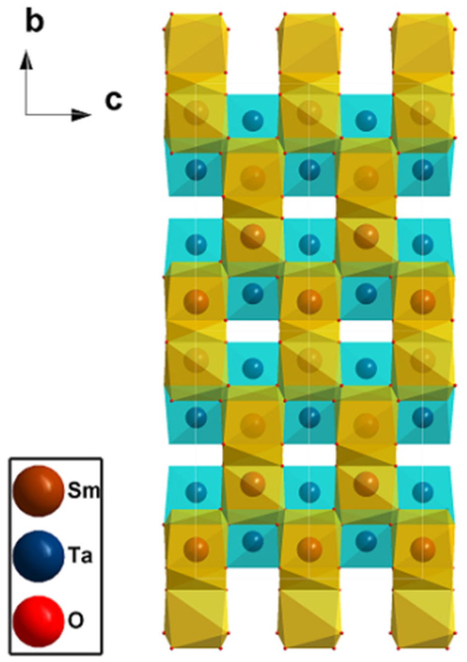 Figure 2 depicts the refined crystal structure. The SmO8 dodecahedron is generated, along with its two neighbors, along the b–c plane to form a general folding line shape, and the TaO6 octahedrons connect these dodecahedrons with their vertices. Figure 1b presents the corresponding XRD pattern calculated based on this crystal structure; this result matches the experimental outcome, and this finding verifies the accuracy of the structure model.