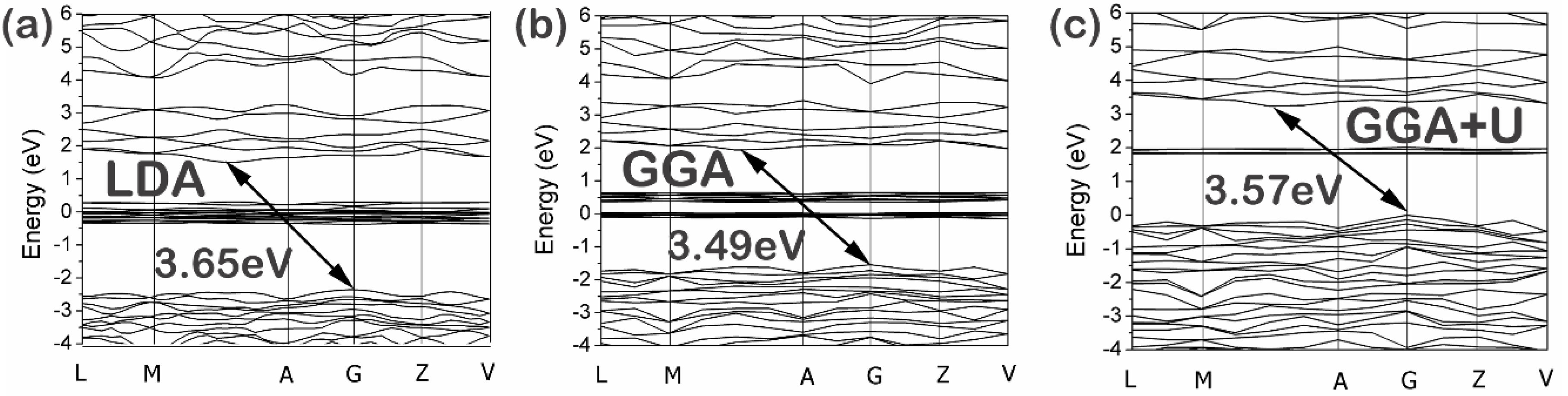 Band structure of SmTaO4 as calculated with (a) local density approximation (LDA); (b) generalized gradient approximation (GGA) and (c) GGA with additional Hubbard correlation terms (GGA + U).