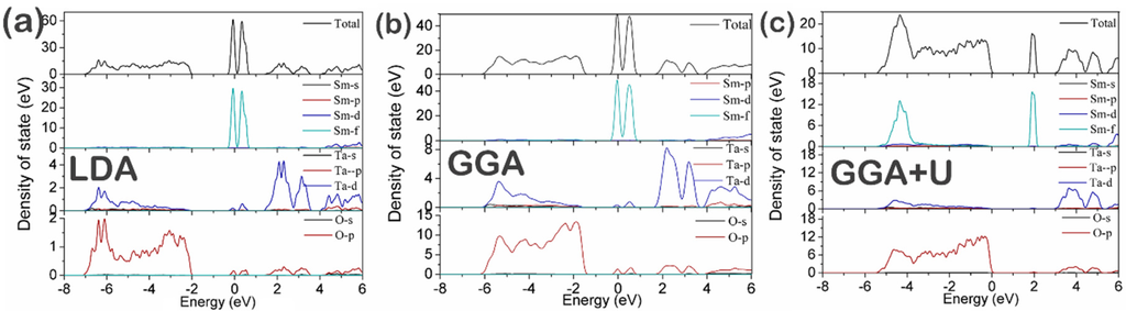 As mentioned previously, the partially filled Sm 4f states are located at the Fermi level when a one-electron method with an orbital-independent potential is applied, such as LDA and GGA. This result is inconsistent with that observed in the experiments during the insulating state. In contrast, GGA + U facilitates the study of various strongly correlated compounds and improves considerably on LDA and GGA []. Therefore, GGA + U can provide appropriate results for SmTaO4.