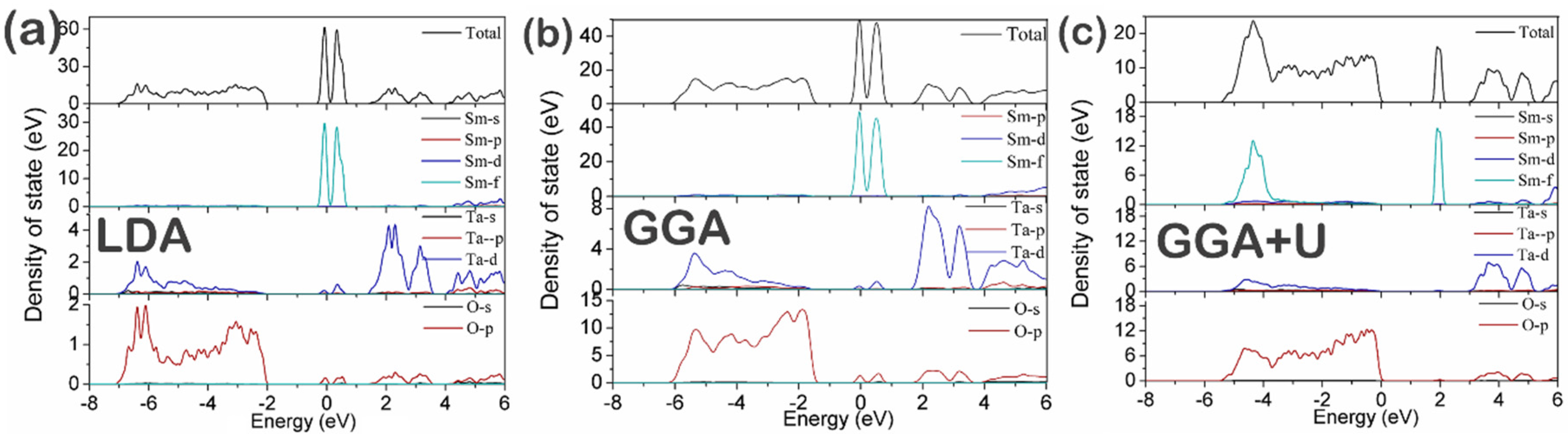 Total and partial densities of state of SmTaO4 as calculated with (a) LDA, (b) GGA and (c) GGA+ U.