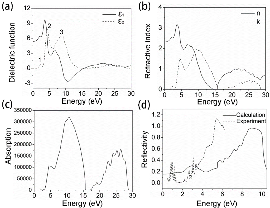 Optical properties of SmTaO4 as calculated with GGA + U: (a) dielectric function; (b) refractive index; (c) absorption coefficient and (d) reflectivity.
