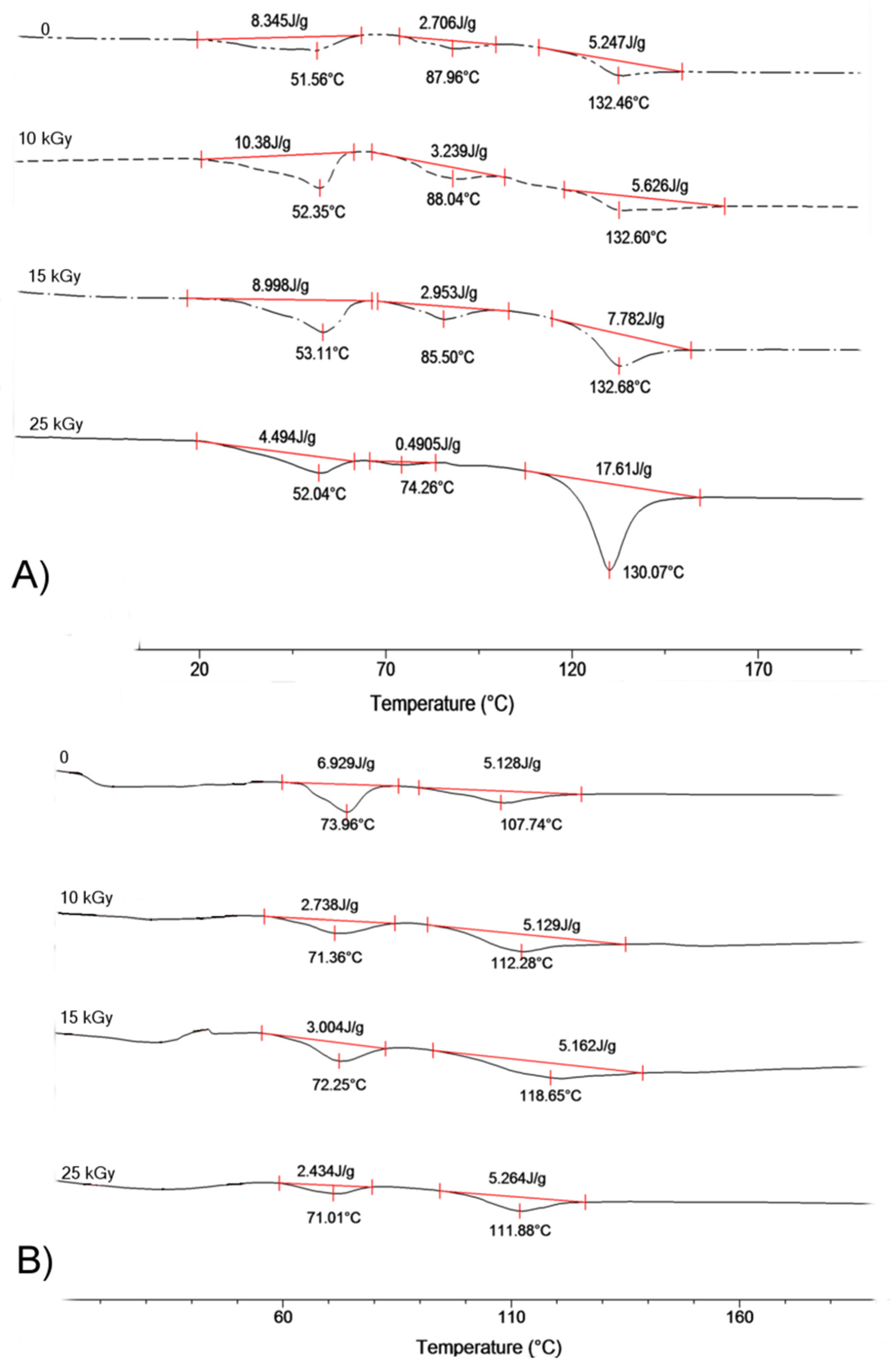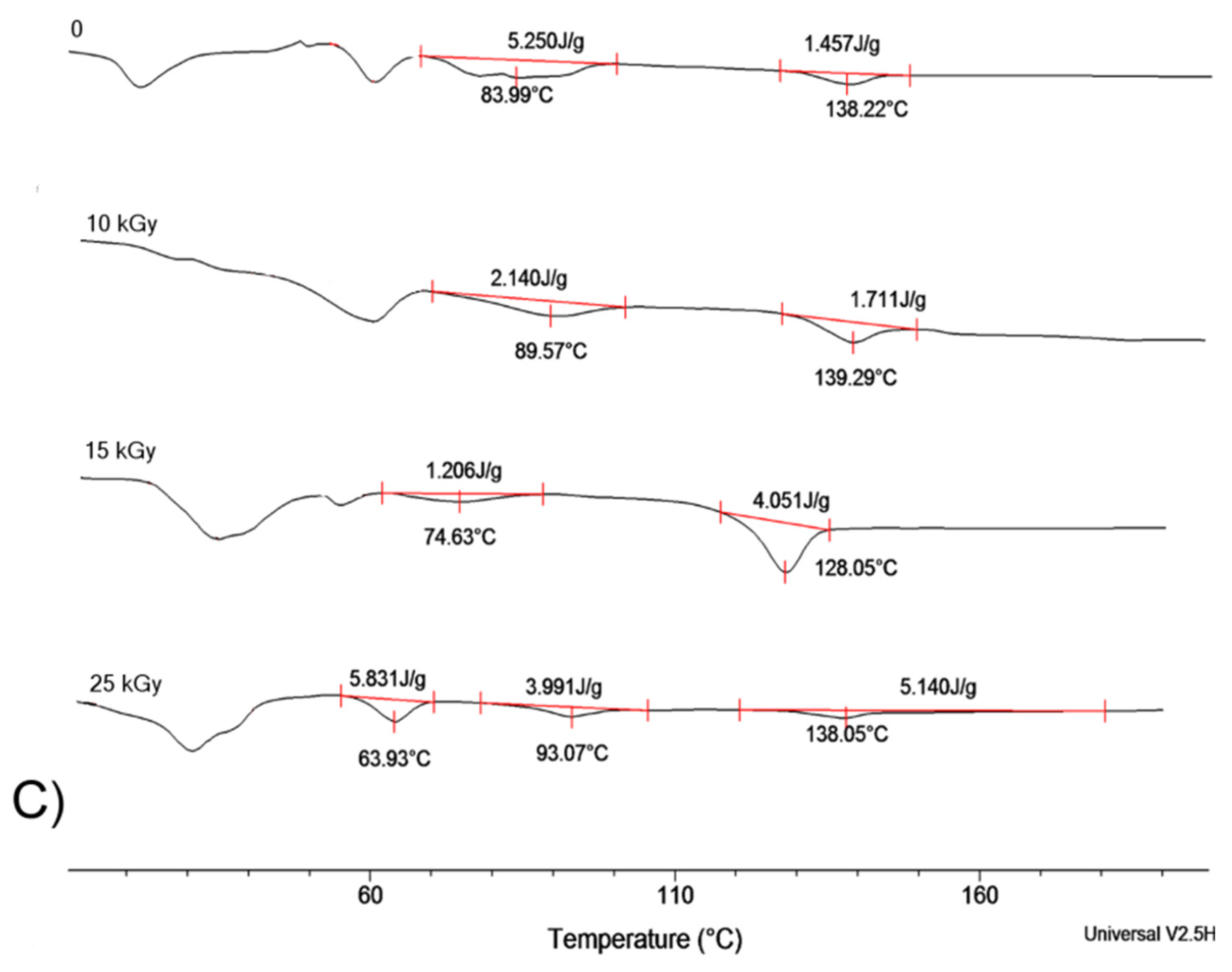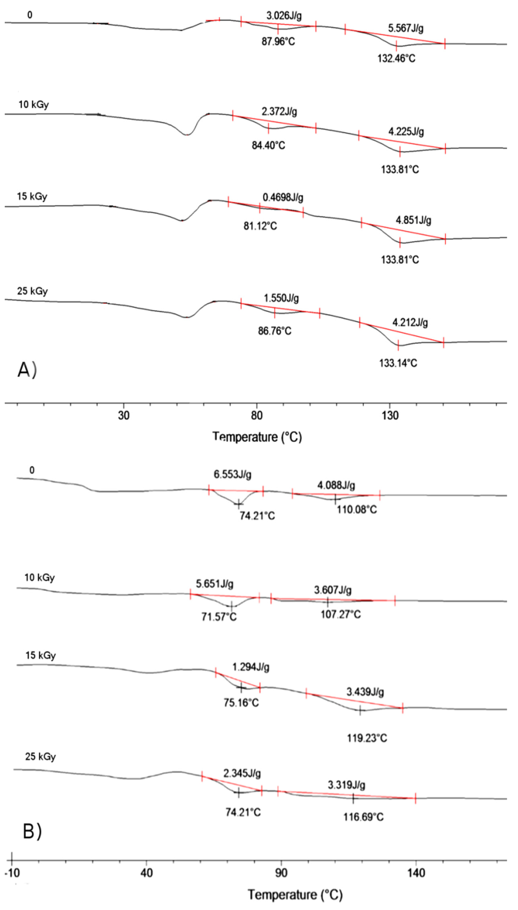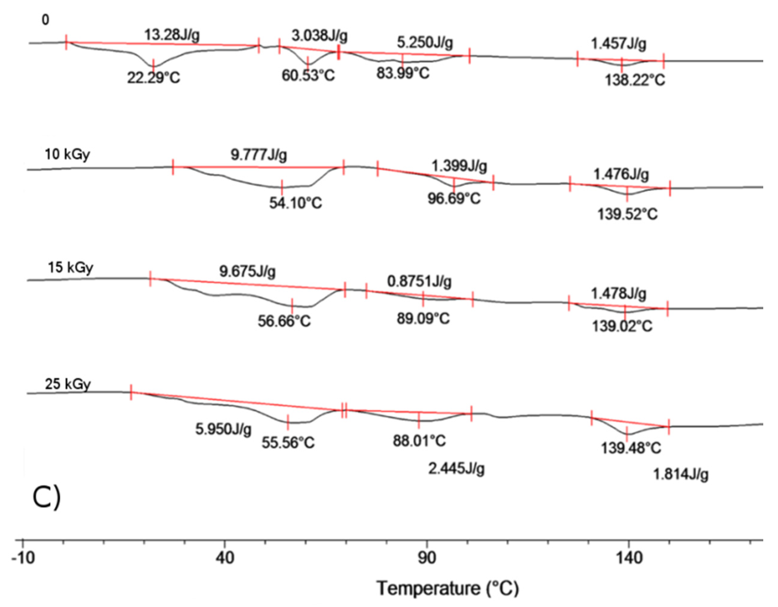 DSC trace for copolymer (A) LGT21 C; (B) LGT40 C; and (C) LGC C. I-heating run at 20 °C/min after electron beam irradiation with dose: 0 kGy, 10 kGy, 15 kGy, and 25 kGy.