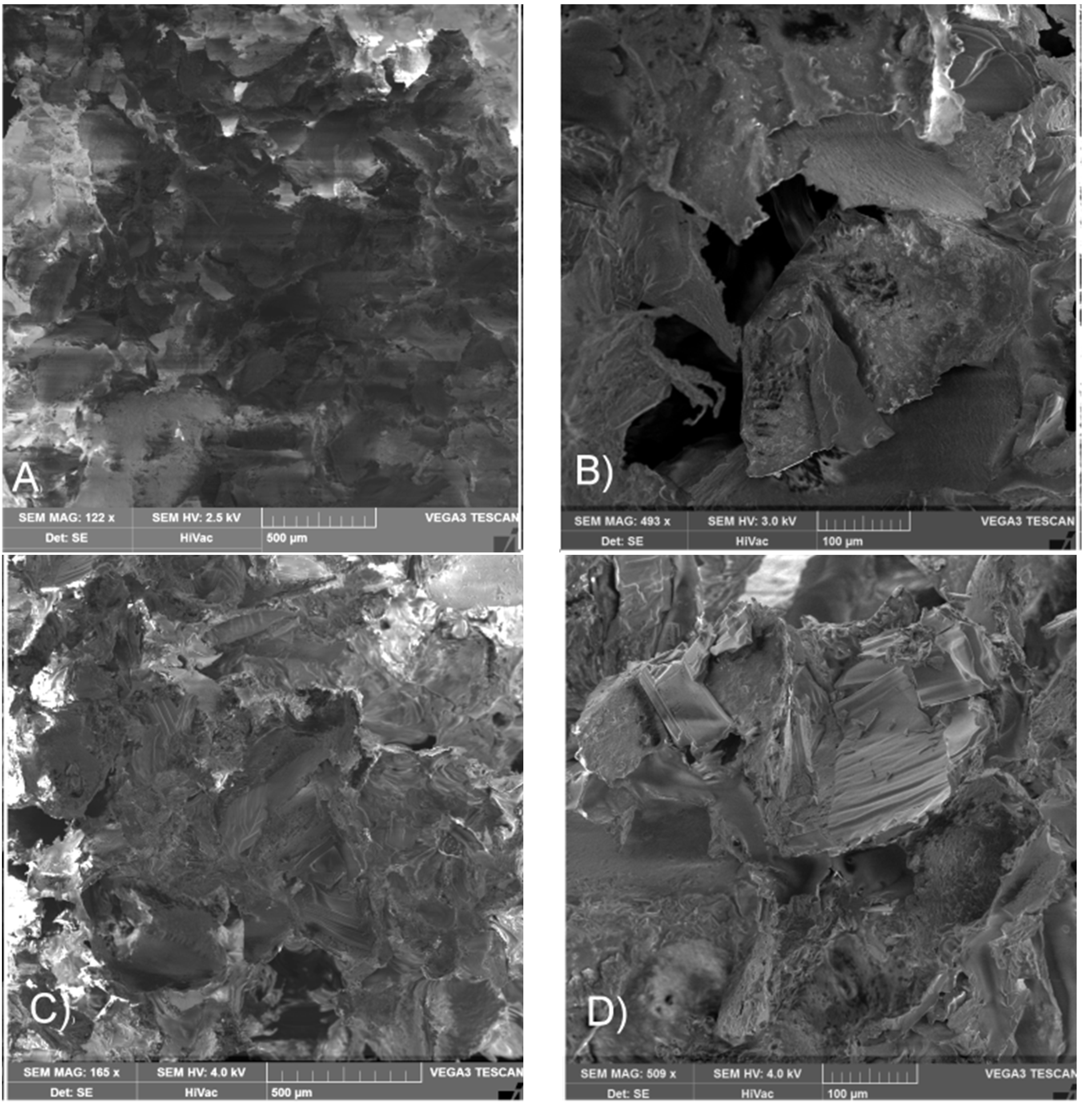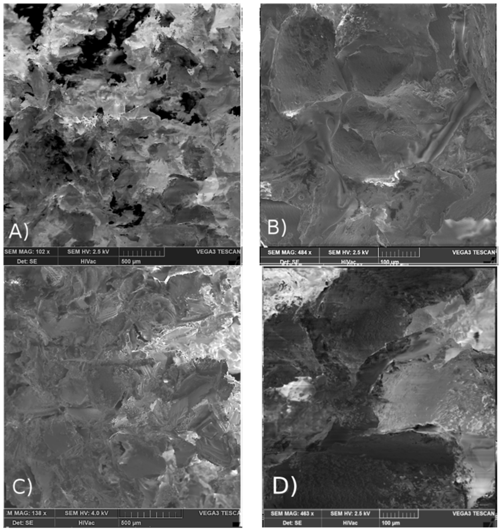 SEM pictures of porous surface of scaffold LGT40 C; (A,B) before sterilization and (C,D) after γ sterilization with irradiation dose of 25 kGy.