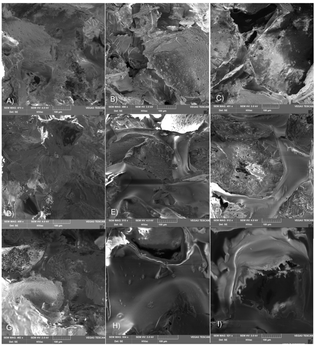 SEM pictures of scaffolds pore surface after electron beam sterilization made of terpolymer LGT21 C with dose (A) 10 kGy; (B) 15 kGy; (C) 25 kGy; terpolymer LGT40 C with dose (D) 10 kGy; (E) 15 kGy; (F) 25 kGy and terpolymer LGC C with dose (G) 10 kGy; (H) 15 kGy; and (I) 25 kGy.