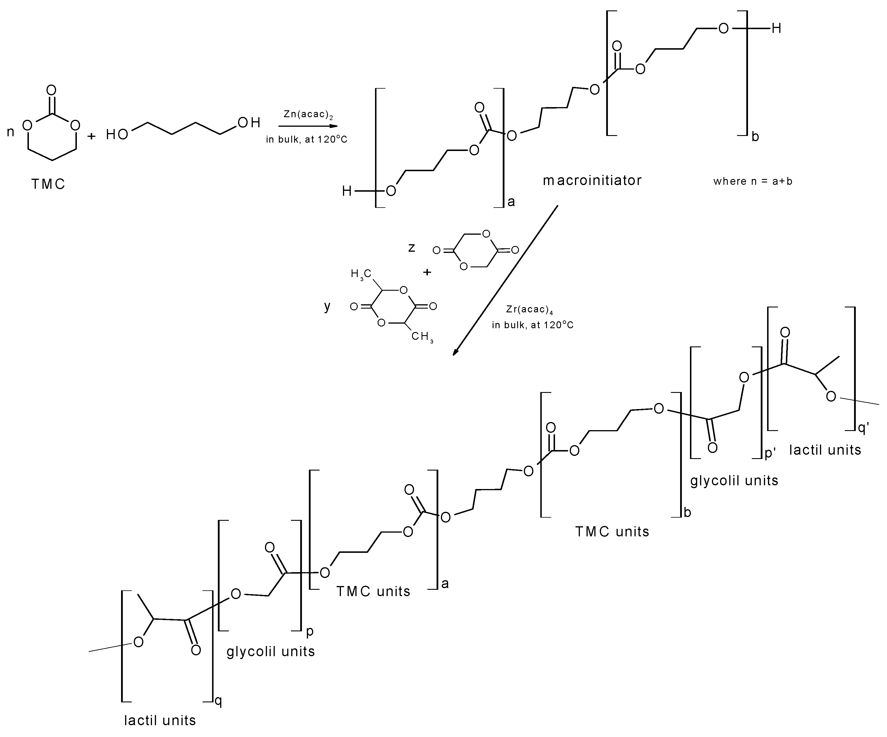 l-Lactide, glycolide (Glaco Ltd., Beijing, China) were purified by recrystallization from ethyl acetate solution and dried in a vacuum oven at room temperature; ε-caprolactone (Fluka, Steinheim, Germany) was dried with calcium hydride and distilled under argon atmosphere before use. Trimethylene carbonate (Ingelheim Boehringer, Ingelheim am Rhein, Germany), dry chloroform and methanol (Aldrich, Steinheim, Germany) were used as received. Initiators and catalysts: zirconium (IV) acetylacetonate—(Zr(acac)4), zinc(II) acetylacetonate monohydrate, 1,4-butanediol (Zn(acac)2xH2O), (Aldrich, Steinheim, Germany) were used as received.