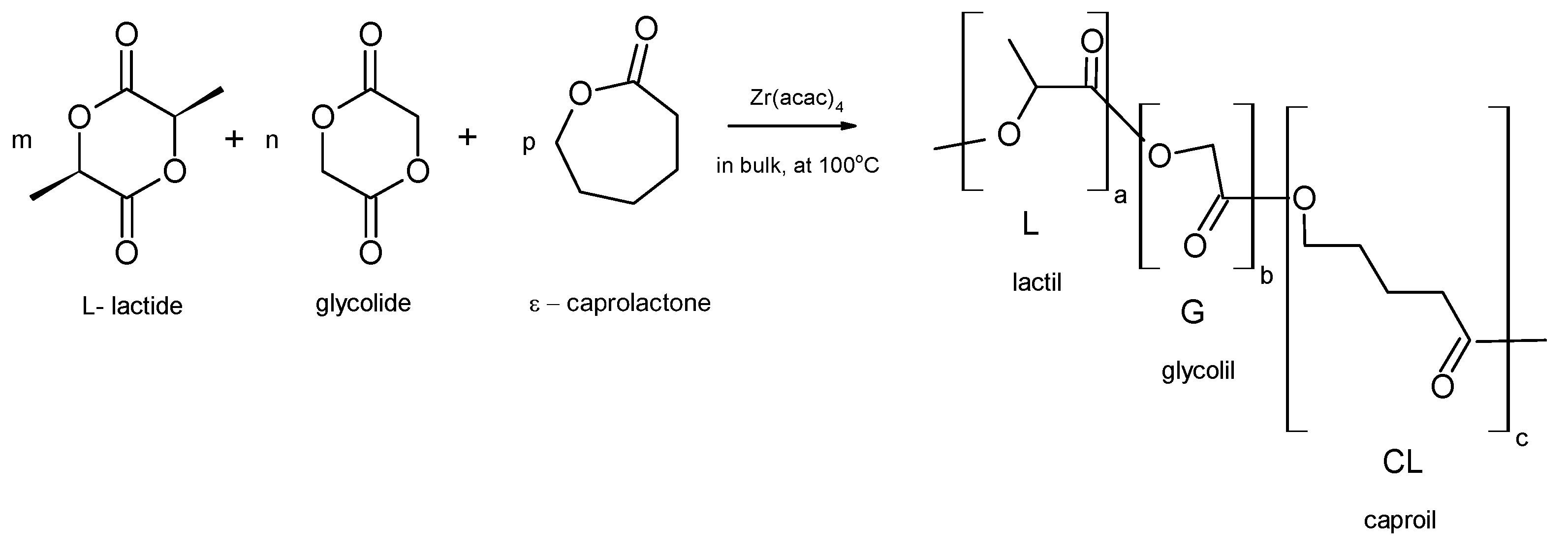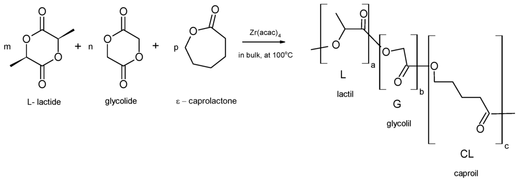 - Dobrzynski, P. Synthesis of biodegradable copolymers with low-toxicity zirconium compounds. III. Synthesis and chain-microstructure analysis of terpolymer obtained from l-lactide, glycolide, and ε-caprolactone initiated by zirconium(IV) acetylacetonate. J. Polym. Sci. Part A Polym. Chem. 2002, 40, 3129–3143. [Google Scholar] [CrossRef]
