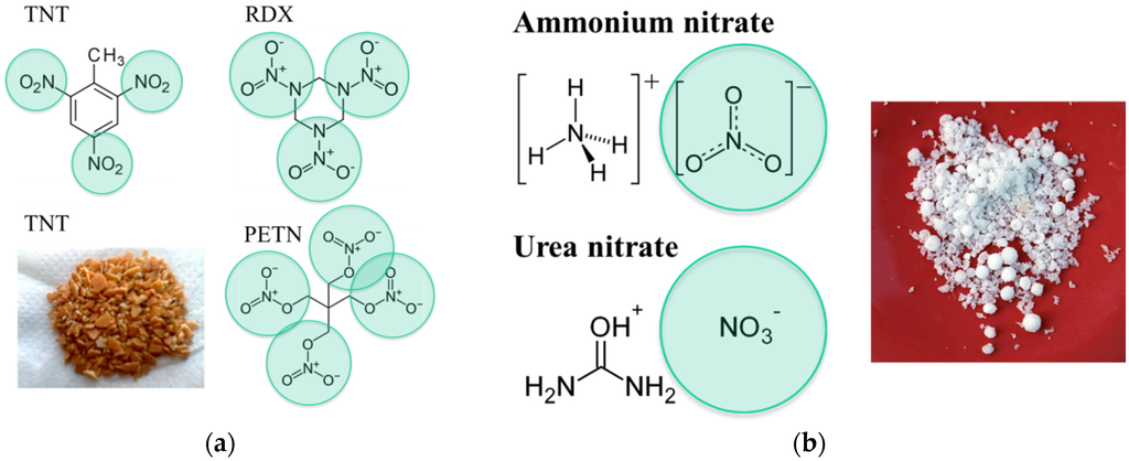 Molecular structure of explosives: (a) military high explosives; (b) improvised explosives. All substances contain strongly electron-attracting NOx side groups (marked by green circles.