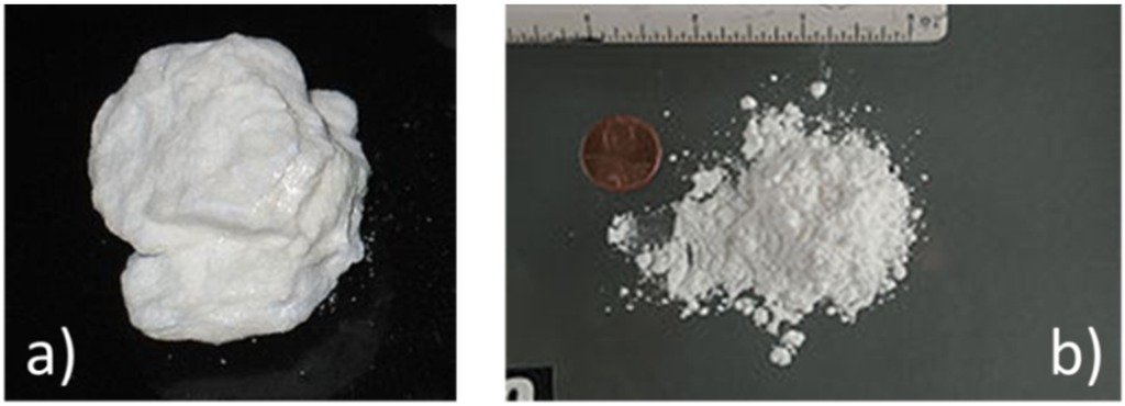 Illicit drugs, like explosives, also abound in the form of low vapor pressure molecular solids. As such, they also cannot be directly detected using conventional forms of gas or vapor detectors. Another specific feature of illicit drugs is that these can abound in two distinctly different forms, i.e., in free-base and in salt forms. In the first form, the drugs are insoluble in water, while they are water-soluble in the latter. Figure 3 shows samples of cocaine in these two forms. The salt form can be obtained by treating the material in its free-base form with strong acids, as for instance HCl. The data compiled in Table 3 further show that, similar to explosives, illicit drugs can be easily transformed into detectable vapors by mild heating. Melting and boiling points again are in the order of 200 °C.