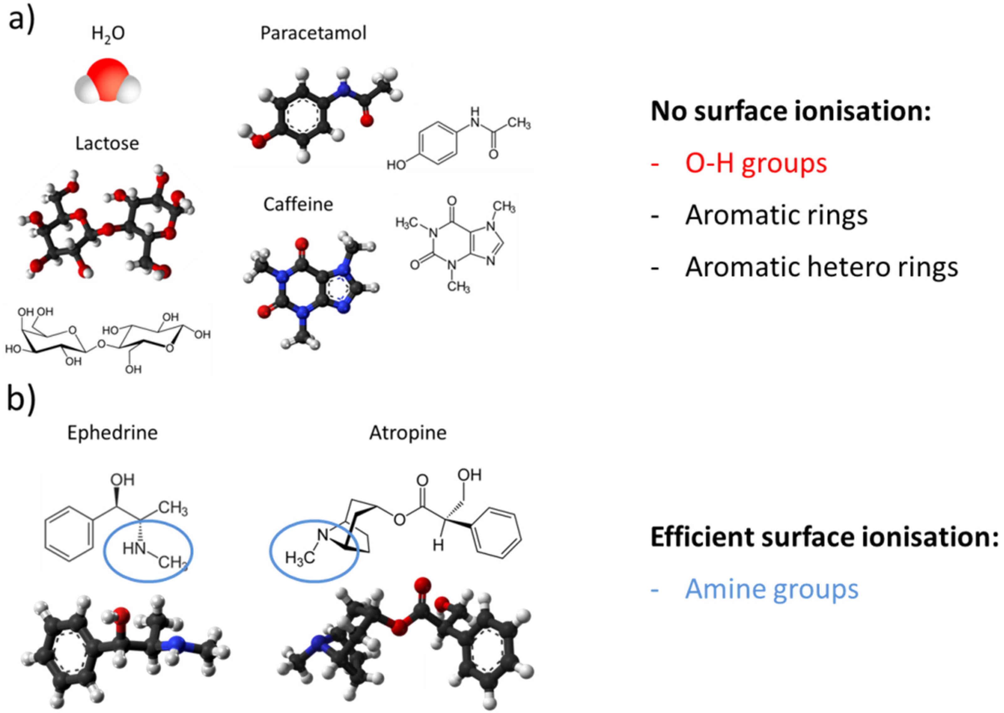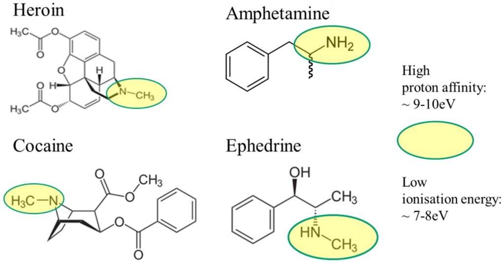 Once vaporized, the drugs can again be detected and distinguished against interfering substances on account of their specific molecular properties. Like explosives, illicit drugs feature a hydrocarbon skeleton and various functional side groups attached to this skeleton. The most important kind of side group in illicit drugs is amine functional groups (yellow ovals in Figure 4). The nitrogen lone pair electrons in these groups contain extra electronic charge, which makes them proton-attracting. In short: illicit drugs exhibit the important property of gas phase basicity and, thus, the ability to form positive ions by extracting protons from their chemical environments.