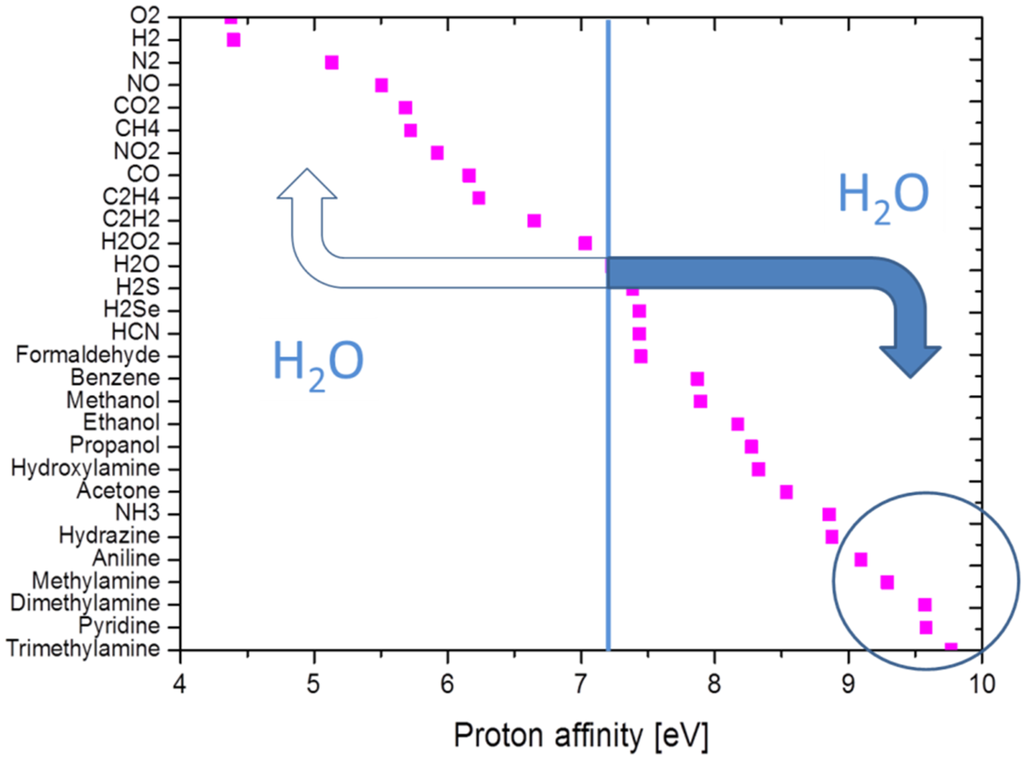 Proton affinity of selected molecules. The blue line highlights the proton affinity of water, i.e., the energy released in the gas phase reaction H2O + H+ → H3O+. Starting from H3O+ ions, protons will be transferred to higher proton-affinity molecules (filled arrow) in the course of gas-kinetic collisions, while a transfer to lower proton-affinity ones is extremely unlikely (empty arrow).