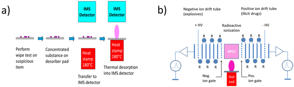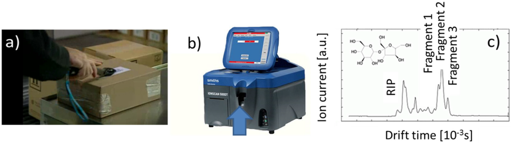 For the purpose of the present paper, it is important to understand how this technology works and how it is applied in typical security screening scenarios. The target of interest in security screening is usually an item that may contain either explosives or illicit drugs. Upon filling drugs or explosives into these items, their outside surfaces normally become contaminated with traces of these target substances. These traces usually consist of particle residue with diameters in the size of micrometers or below. These contaminations therefore are not normally visible to the unaided eye, but are very sticky and, therefore, very useful for examination. In order to collect such traces of target material, a so-called swab, essentially a piece of porous cloth, is moved across the suspect surface with the help of a sampling spoon (Figure 6a). This spoon is spring-loaded to exert a constant pressure on the searched surface. After wiping the suspect surface, the swap usually has taken up a considerable number of microscopically small target particles. With this particle load, the swap is inserted into the insertion port of an IMS (Figure 6b). Once inserted, a pre-heated metal rod is pushed up against the bottom-side of the swab, and the trace impurity materials trapped within this swab are vaporized into the ionization region of the IMS. There, either positive (illicit drugs) or negative (explosives) substance ions are generated, which are subsequently analyzed for their molecular masses. Overall, an IMS performs as a time-of-flight mass spectrometer working at full ambient pressure. Figure 6b shows an IonScan500 instrument (Smiths Detection, Hertfordshire, UK), a type of IMS that is widely used in international airports [34]. Its attractive feature is that it contains both a positive and a negative ion drift tube within the same instrument. Due to this versatility, it allows both explosives and illicit drugs to be detected within one piece of hardware. Figure 6c shows an example of an ion drift spectrum obtained after ionizing the molecules shown in the inset of this same figure. Table 4 summarizes main features of state-of-the-art instruments. Whereas the IonScan 500 uses radioactive ionization, more recent developments in the IMS field aim to replace the radioactive ionization and, thus, intend to make IMS instruments more easily usable. Alternatives to the widely-employed radioactive ionization are photo ionization [35], two-photon laser ionization [36] and corona ionization [37].