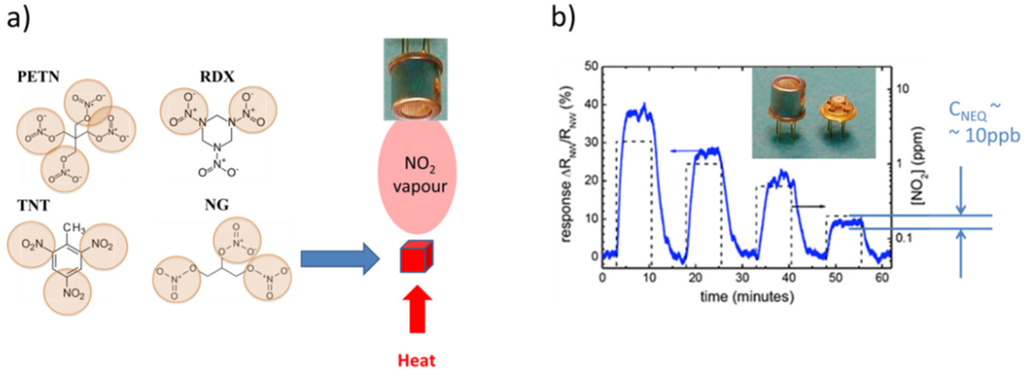 The considerations in Section 2 have shown that sampled explosives particle residue melts and decomposes very easily, producing NO2- and NOx-containing molecular fragments. NO2, in turn, can be very easily and very sensitively detected using MOX gas sensors [43]. The principle feasibility of using MOX gas sensors to detect TNT is demonstrated in Figure 9.