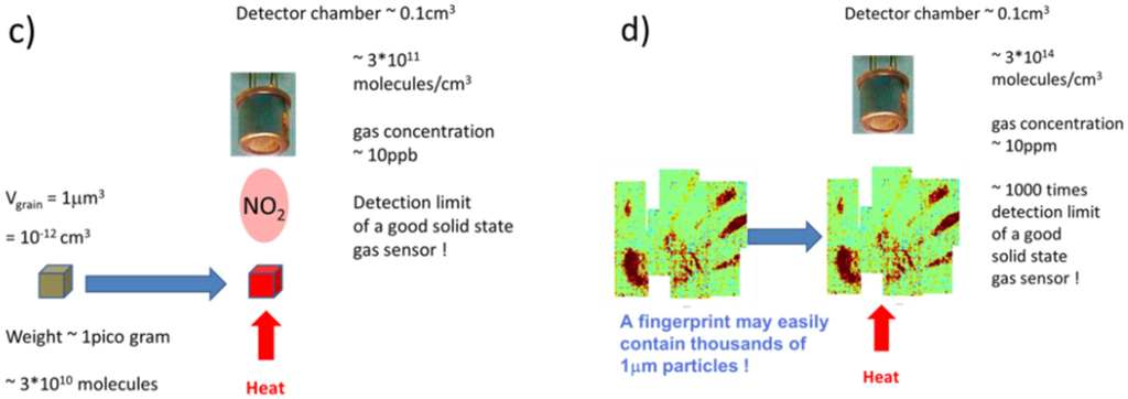 Use of MOX gas sensors for explosives detection: (a) explosives disintegration producing NO2 vapors; (b) NO2 sensitivity of a commercial NO2 sensor featuring a noise-equivalent resistive response of about 10 ppb; (c) an evaporation/disintegration of a 1-µm grain of explosive producing the noise-equivalent NO2 concentration; (d) thermal conversion of a hand/finger print of explosives producing an easily detectable NO2 concentration.