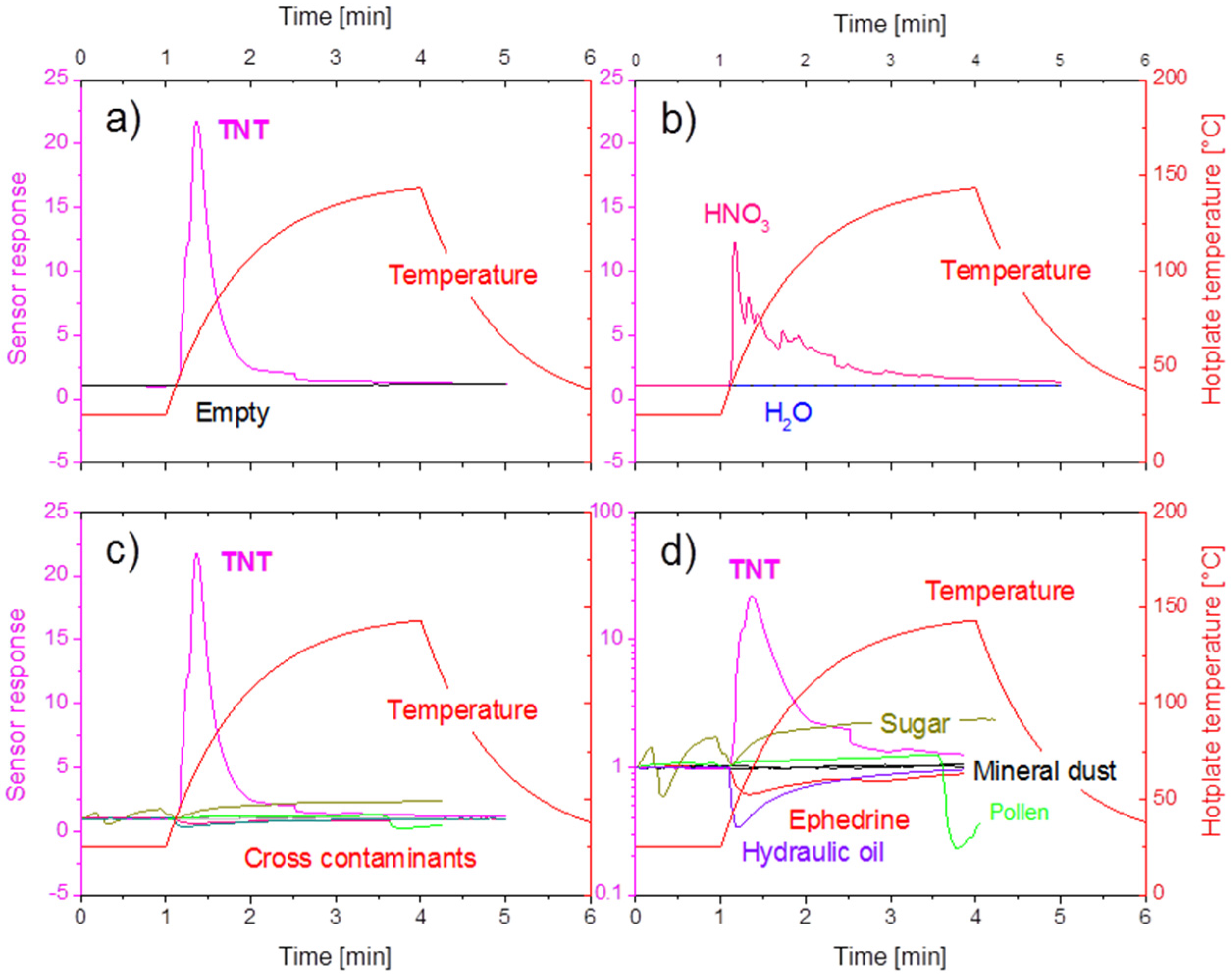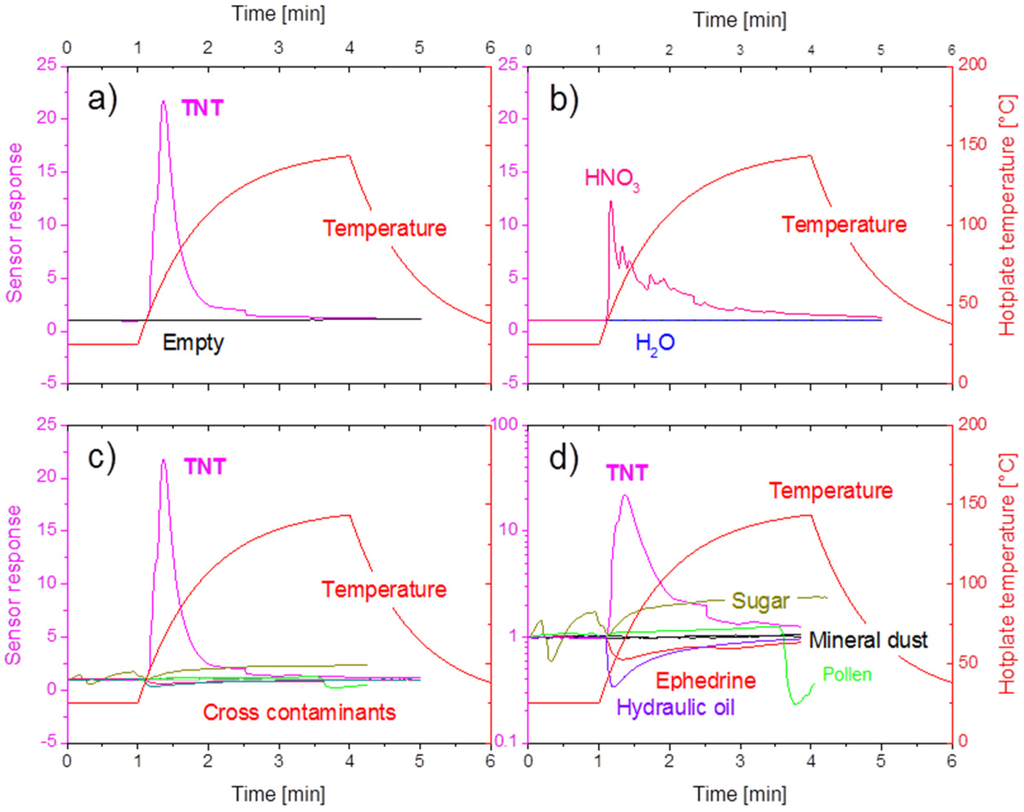 (a) Response of a single NO2 MOX sensor to an empty (black) and a TNT-loaded hotplate (magenta) when the hotplate temperature (red) is ramped up; (b) control experiment in which pure water (blue) and nitrous acid (HNO3) are evaporated; (c) control experiment in which many kinds of background particle (liquid) residue were evaporated; (d) same data as in (c), but plotted on a logarithmic scale.