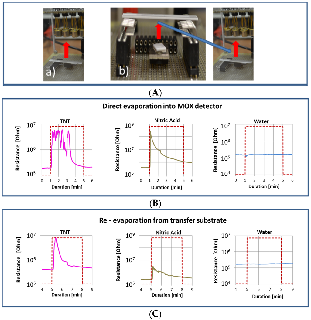 In this chapter, we build on the lessons learnt from IMS technology, namely that explosives and illicit drugs should be sampled in the form of solid particle residue and be evaporated into backend vapor detectors to produce short and relatively intense flashes of vapor. In the following, we report on experiments that had been carried out with the aim of assessing the feasibility of small and inexpensive MOX gas sensors to serve as backend vapor detectors [38,39,40,41,42]. As a first result, we show that combinations of thermal solid-vapor converters with MOX gas sensors are able to detect explosives particle residue (Section 4.1) and illicit drugs (Section 4.2) with sufficient sensitivity to live up to the demands of security threat detection. As a second result, we demonstrate in Section 4.3 that the intrinsic selectivity of such thermal converter-detector combinations can be considerably enhanced when the solid particle residue is acquired through electrostatic particle precipitators (ESP) [16]. In this way, the selectivity-generating power of APCI processes can be employed to separate the potential target particle residue from the huge background of analytically irrelevant dust.