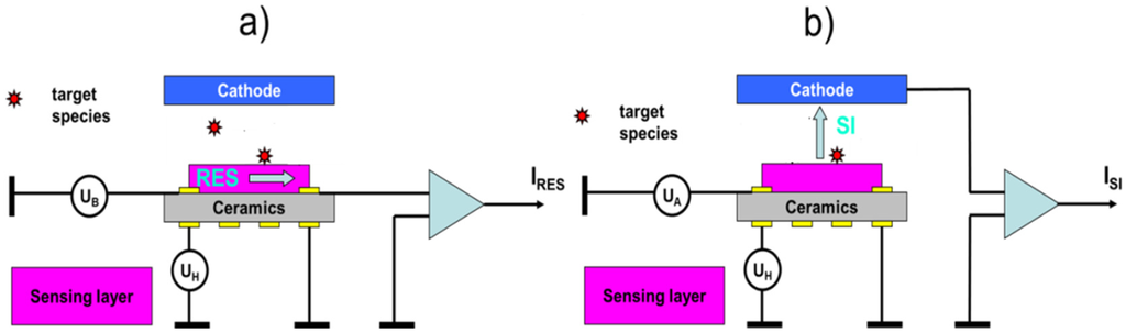 - Hackner, A.; Bouxin, B.; Müller, G. Surface ionisation gas detection: Vertical versus planar readout modes. Sens. Actuators B Chem. 2013, 188, 286–292. [Google Scholar] [CrossRef]