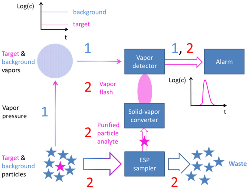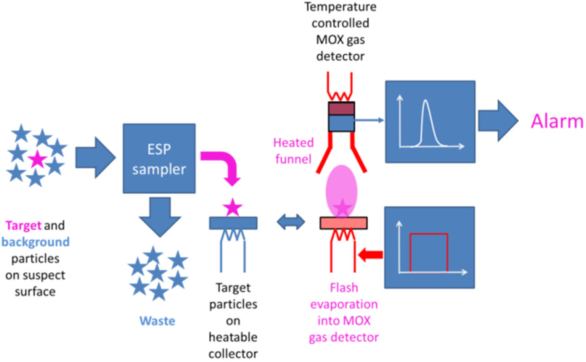 Sensor system for sampling, sorting and converting low vapor pressure target particles into detectable vapors. ESP, electrostatic precipitation.