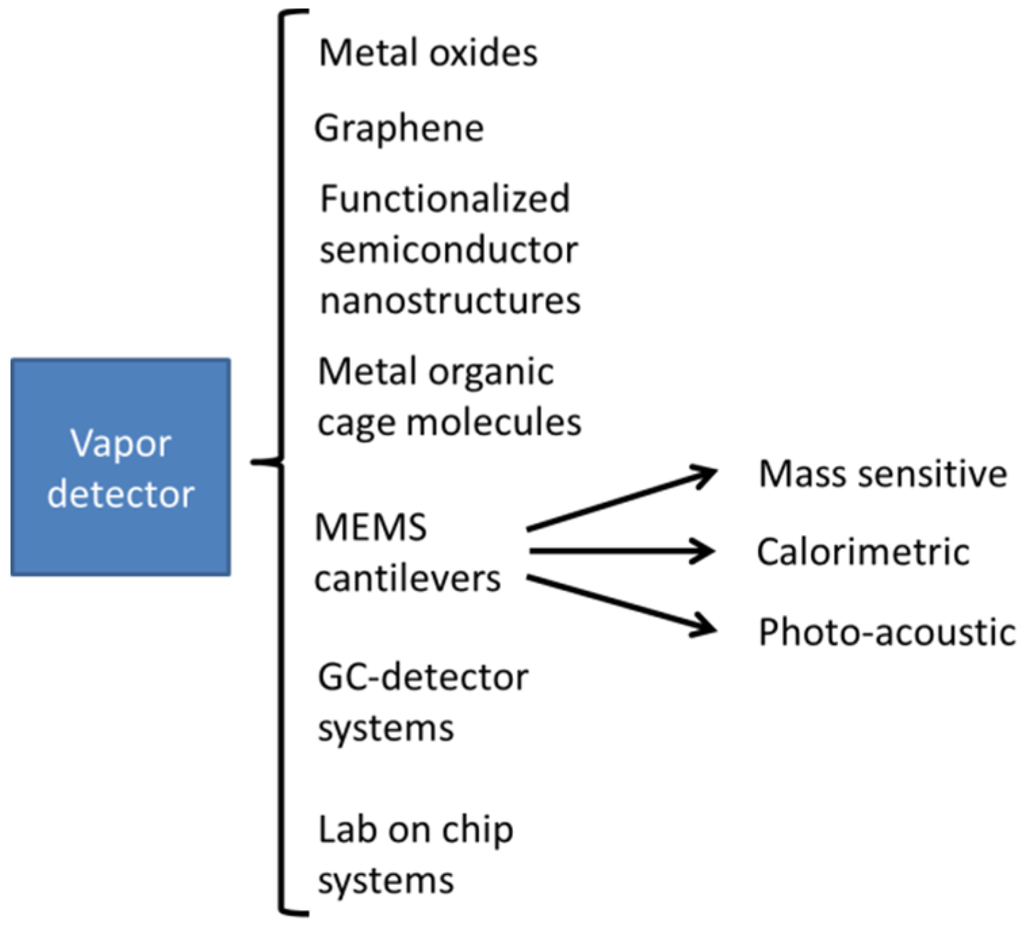 Protecting the freedom and security of Europe and its citizens is one of the key objectives of the European Union (EU) and a major subject in the FP7 and Horizon 2020 programs [4,5]. Measures supported by the EU range from general and holistic approaches to chemical, biological, radioactive, nuclear and explosive (CBRNE) preparedness and resilience [6,7] up to the development of specific supporting technologies to ensure CBRNE security [8,9,10,11]. The arena of CBRNE sensor technologies, in particular, has proven to be a very attractive field to researchers with a background in gas sensors and gas sensor materials. These and related development programs in the U.S. [12], in fact, have produced a great deal of innovative and very promising sensor approaches [13], which however have not yet made a significant impact in the security sensor market. The tacit assumption in almost all of this innovative work is that the gas sensors in question need to be able to detect in a direct manner the extremely small concentrations of target gases that emerge from military high explosives and from illicit drugs. As the equilibrium vapor pressures of almost all of these materials are far below any of those concentrations of reactive gases that normally abound in the ambient air, the detection of security threats requires extremely sensitive and selective sensor devices. Extreme sensitivity and selectivity, in principle, can be attained by sampling huge amounts of air through pre-concentrators, which contain highly selective adsorbents [14,15]. The collected target molecules can then be flash-evaporated into less sensitive and less selective backend vapor detectors to generate an alarm. Even if such pre-concentrator detector solutions can be devised, the very long sampling times required usually do not conform to the tight time constraints that exist in typical security monitoring applications.
