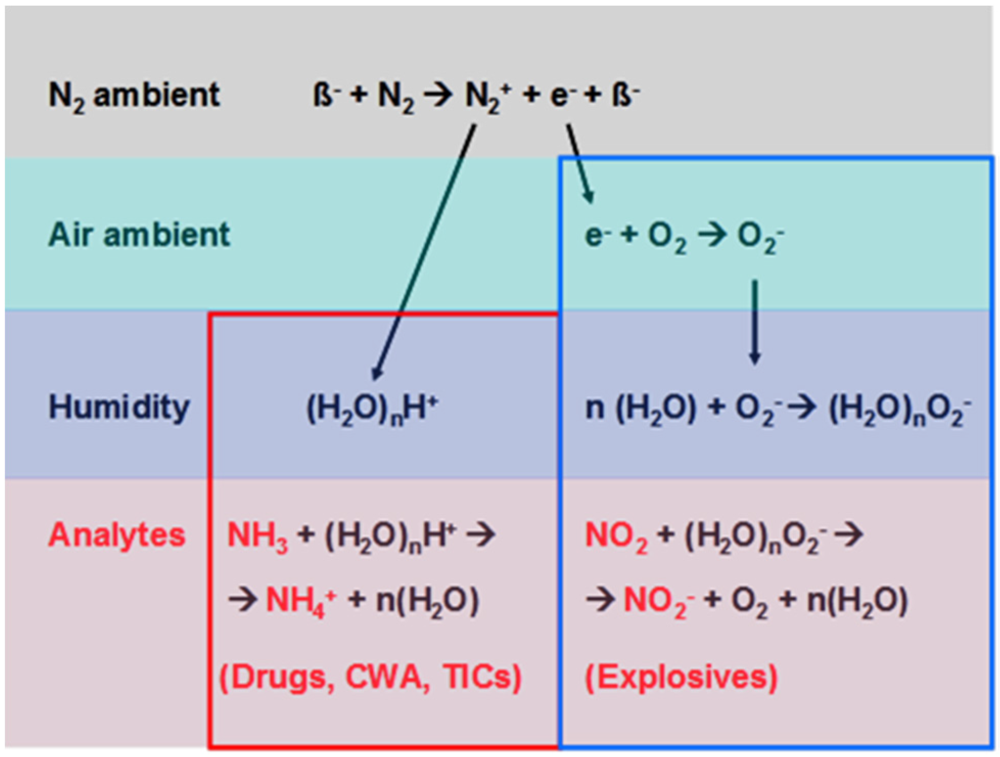 (Top panel) Radioactive ionization of N2 molecules by high-energy electrons (β-particles) leading to positive (hydrated protons) and negative (low-energy electrons) ionization products. In the follow-on atmospheric pressure chemical ionization (APCI) processes, the initial ionization products become attached to increasingly higher proton- or electron-affinity molecular species, thus forming positive (left) and negative (right) analyte ions, here represented by NH3 and NO2 ones. (CWA: chemical warfare agents; TICs: Toxic industrial compounds). For more details, see [17].