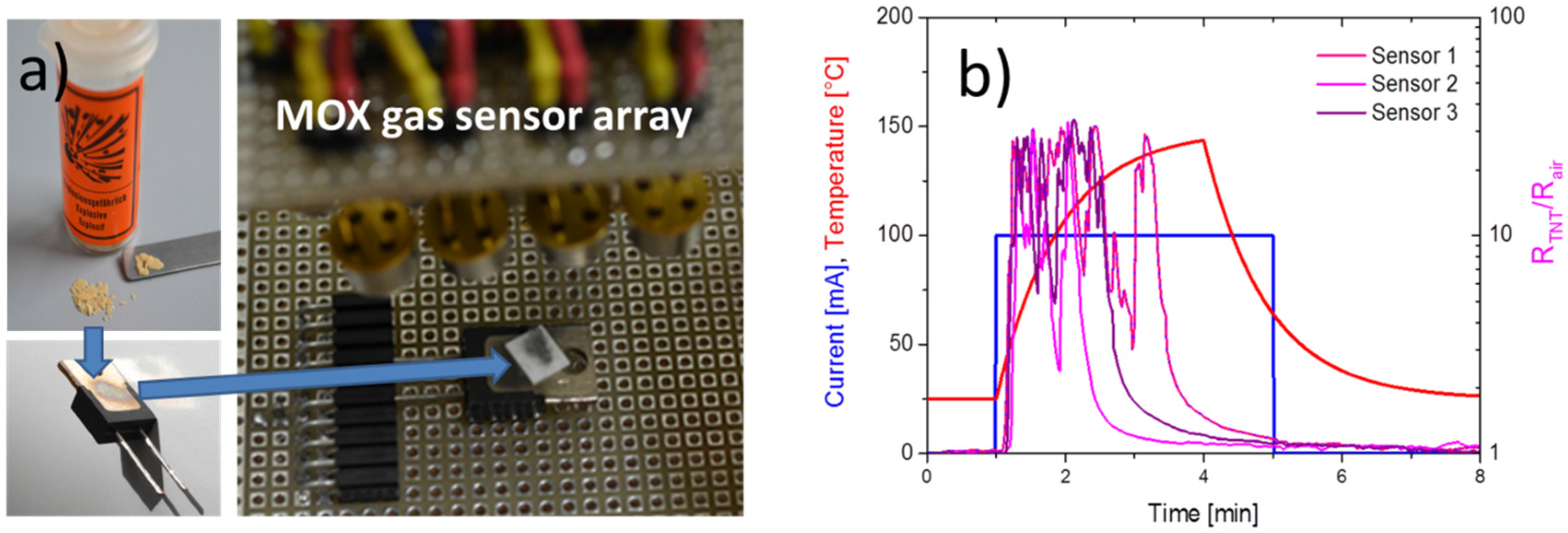 (a) Evaporation of TNT particles from an electrical heater into a MOX gas sensor array; (b) response of the sensors to the evaporating TNT particles (blue: current input into the heater element; red: resulting temperature ramp; colored curves: relative resistance response of the sensors to the resulting TNT vapor pulses.