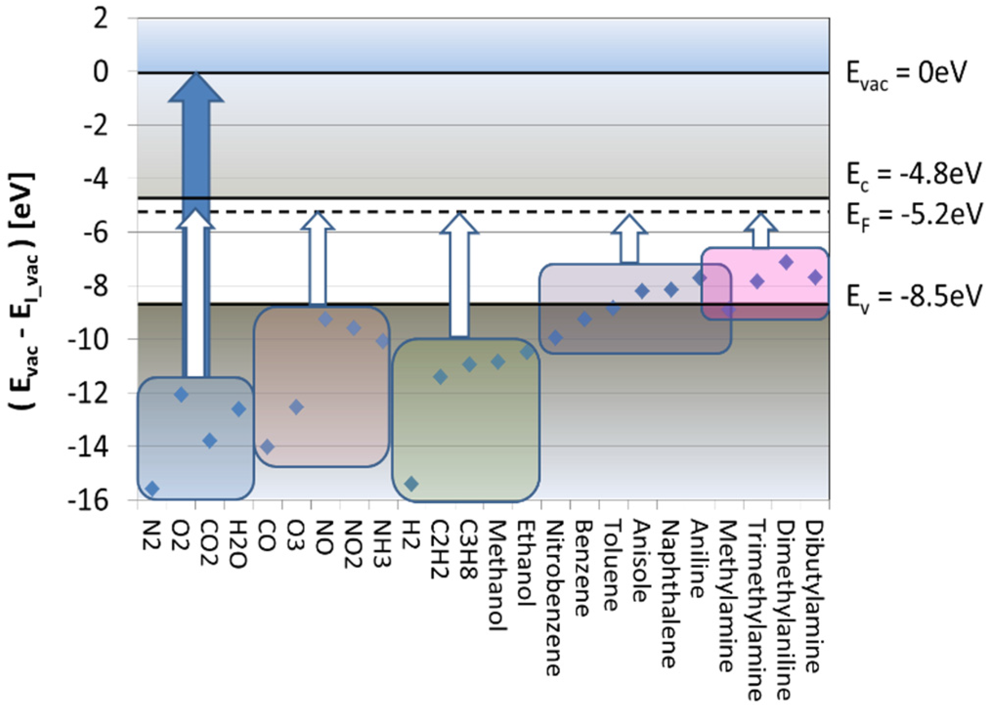 A common property of all those materials, and an obstacle with regard to their detection, is that all of these abound in solid form at normal ambient temperature and pressure conditions (Figure 2) and that thus these are not normally detectable using common types of solid-state gas sensors. This latter fact can be easily seen by considering the vapor pressure data compiled in Table 1. The common reason for the low volatility of explosives is that these abound in the form of molecular solids with a high binding energy within the constituent molecules themselves and a low binding energy between nearest-neighbor molecules. In terms of macroscopic properties, this small inter-molecule binding energy translates into low melting and boiling points. Table 1 shows that melting points are in general well below 200 °C, while boiling points are in the order of 150–300 °C. Table 1 also shows that boiling often coincides with molecular decomposition. Once vaporized, the solids decompose into individual molecules, and these further decompose into smaller fragments. Experimentally, it was found that all explosives produce a cloud of reaction products, most notably nitrogen dioxide (NO2), nitric oxide (NO), ammonia (NH3), hydrogen (H2), carbon monoxide (CO), carbon dioxide (CO2), nitrogen (N2), oxygen (O2) and methane (CH4) [18]. Among those, NO2 is the one that is most easily detected at low concentrations and with relative selectivity using solid state gas sensors. The basic reason for its easy detectability is its exceptionally high electron affinity, which sets it aside from most other gases in the ambient air (Table 2) and which enables it to extract very efficiently conduction electrons from semiconductor materials.