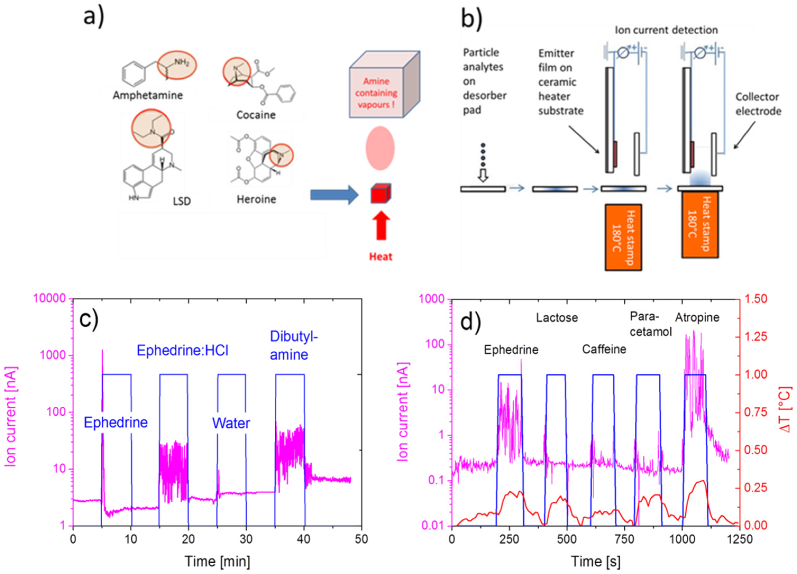 During his time at EADS Innovation Works (EADS: European Aeronautic Defence and Space Company), Gerhard Müller was project manager of the above-mentioned EU projects. Gerhard Müller also wrote up the current paper. Angelika Hackner performed the work on the surface ionization detection of illicit drugs. Sebastian Beer and Johann Göbel worked on the MOX detection of explosives and developed the electrostatic particle precipitation (ESP) sampling technique.