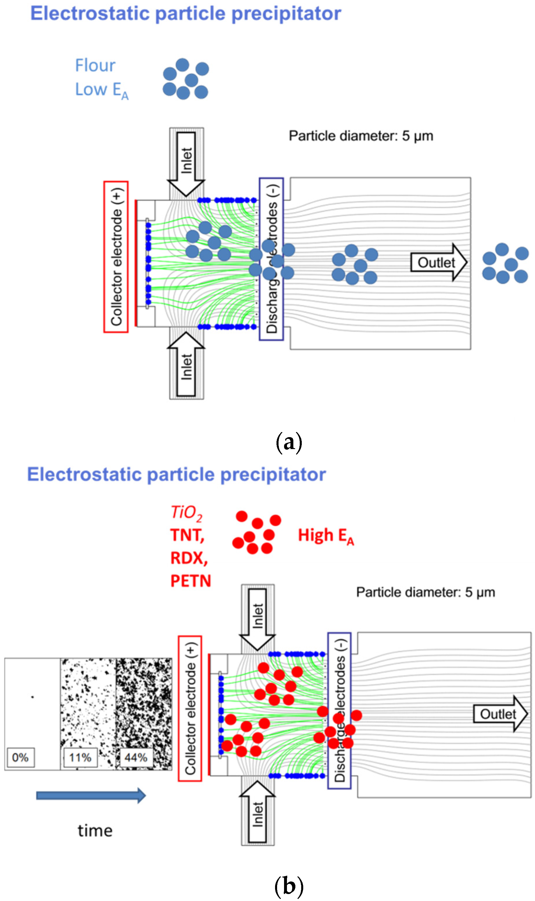 - Beer, S.; Müller, G.; Wöllenstein, J. Development and characterization of an electrostatic particle sampling system for the selective collection of trace explosives. Talanta 2012, 89, 441–447. [Google Scholar] [CrossRef] [PubMed]