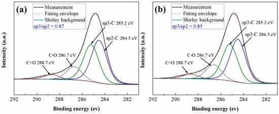 - Silinskas, M.; Grigonis, A. Low energy post-growth irradiation of amorphous hydrogenated carbon (a-C:H) films. Diam. Relat. Mater. 2002, 11, 1026–1030. [Google Scholar] [CrossRef]