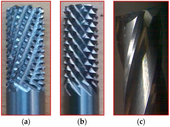 Three tools of Ø 6 mm, made up of tungsten carbide—namely router type (T1), router type (T2) and four fluted helical end mill (T3) as shown in Figure 2a–c—were selected. Table 1 shows the detailed specification of three different tools used in edge trimming of CFRP material. The experimental investigation was made under dry conditions.