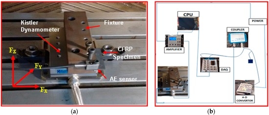 A Kistler type (8152B111) AE sensor with a frequency range from 50 to 400 kHz with a sampling rate frequency of 2.5 Ms/s (Mega samples per second), i.e., 2.5 MHz was bolted in the CFRP specimen. The AE Piezotron Coupler Type 5127B1 is used to supply power to the sensor and for signal processing. The signals from the sensor were then fed into a coupler to process high-frequency sound emission signals. The output signals from the AE sensor were amplified to a level of 60 dB gain by using an amplifier. The amplifier has two series-connected second order filters designed as plug-in elements. A band pass filter is obtained by the series connection of one high-pass and one low-pass filter to eliminate noise and signals caused by phenomena such as collisions and twining of chips that are not directly related to the cutting phenomenon [33]. The data acquisition system was used to acquire signals from the coupler. The AE signals were mainly evaluated by using an analog output signals parameter AE Out (Filter) mean value in volts (which is one of the outputs of AE signal from the coupler like AE rms signal. AE signal obtained from the signal processing corresponding to fluctuations in the amplitude of the AE signals [37]. Figure 4a shows the setup for measurement of cutting forces and acoustic emission signals. Figure 4b shows the wiring diagram of devices connected to measure force and performance of cutting tool. Mitutoyo makes a surface roughness tester (model SJ-411), and Tool maker’s microscope was used to study the state of machined surfaces such as Surface roughness (Ra) and delamination respectively. Measurement of cutting forces (Fx, Fy and Fz) and surface roughness were done with three trials on each condition. Then the mean values were calculated for analysis.