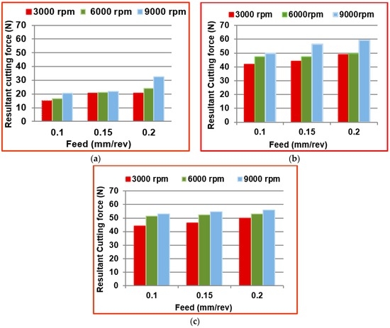 Comparison of resultant cutting forces at different machining conditions with (a) Tool T1; (b) Tool T2; and (c) Tool T3.