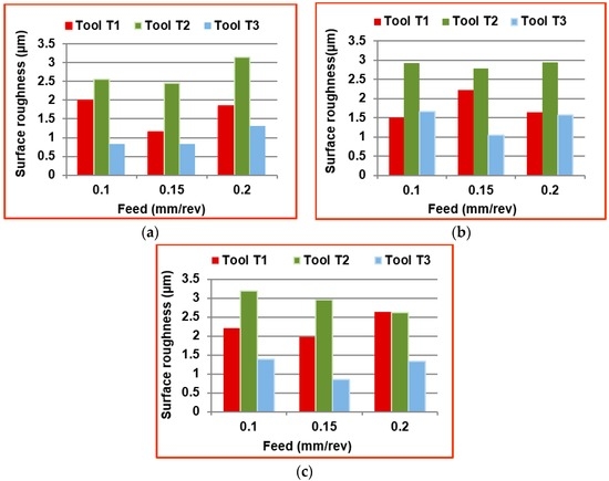 Comparison of surface roughness at different machining conditions with (a) 3000 rpm; (b) 6000 rpm; (c) 9000 rpm.