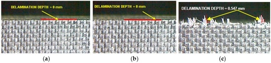 Microscopic images of edges of specimens with delamination depth measured after edge trimming with (a) Tool T1; (b) Tool T2 and (c) Tool T3.