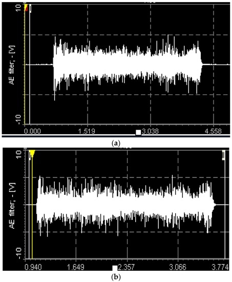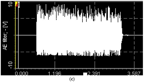 The AE signals were recorded and measured for the 15 passes (70 mm of each pass) equal to the length of machining of 1 m approximately at the cutting condition of high spindle speed of 9000 rpm and high feed of 0.2 mm/rev. AE Out (Filter) values are measured with a sampling rate of 2.5 MHz, and the mean values were used for the analysis. Figure 8a–c shows the images of AE signals recorded during machining at this condition with different tools.