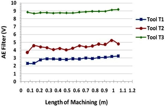 AE Out (filter) values Vs Length of machining for different tools.