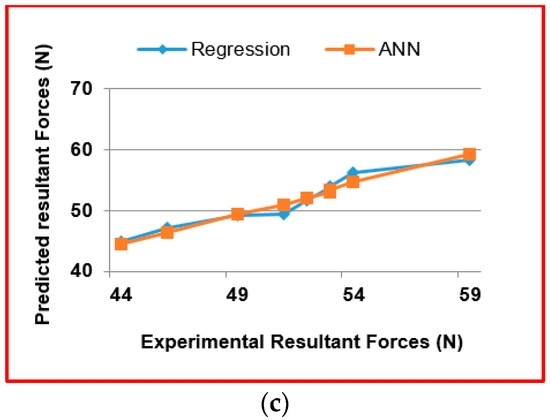 Comparison between regression model and ANN model with the experimental resultant forces. (a) at Tool T1; (b) at Tool T2; (c) at Tool T3.