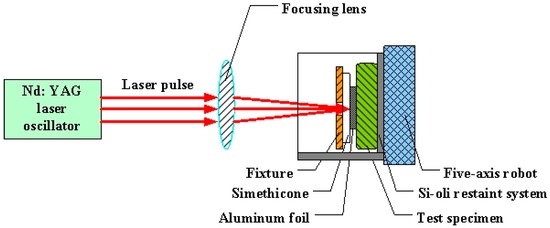 Figure 2 shows the LSP assisted by DSA. The Nd:YAG laser used was produced by the GAIA Company in Paris, France and Table 2 lists its relevant parameters. Flexible constraint of laser shock waves was realized by combining PMX-200 simethicone with the self-developed Si-oil restraint system. Al-foil at a thickness of 120 μm was used as the absorbed layer. The temperature control system adopted was a YS-200S system developed by YOTEC Instrument Co., Ltd., Hsin Chu, Taiwan. The laser energy, the diameter of spots, and the overlapping rate were set as 6 J, 3 mm, and 50%, respectively, while the temperature on the surface of the specimen was controlled at 130 °C. The LSP was vertically conducted on both sides of the specimen while it ran horizontally for 11 rows. The corresponding single-surface active zone measured 18 mm × 15 mm. The welded joints treated after LSP assisted by DSA are shown in Figure 1b. In the contrast test of LSP at room temperature, the Si-oil restraint system, and the temperature control system were removed, while the running water was applied as the constrained layer. Other parameters were the same as those in the LSP assisted by DSA. Dual sided LSP were conducted either once or twice. Three welded joints specimens were treated by LSP assisted by DSA, single LSP and double LSP, respectively.