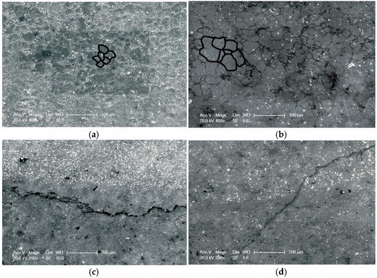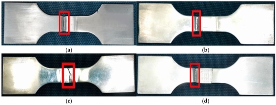 Fatigue fractures in the welded joint not treated by LSP were found in the HAZ stretching to straight lines, as indicated in Figure 6a, while fatigue fractures in the joint treated using LSP assisted by DSA were observed in the substrate region outside the strengthened zone in a similar manner (see Figure 6b). Results indicated that, under the effect of LSP assisted by DSA, the fatigue performance of the specimen in the strengthened zone was substantially improved and exceeded that of the base material of the same size. In addition, it was found that the fatigue fractures of the specimen treated once by LSP at room temperature were jagged lines in the central weld bead, as illustrated in Figure 6c. This is because ER4043 wires with good crack resistance were used in the welding process. As they do not contain alloying elements in fine-grain form, the grains in the central weld bead were coarse and the structure was loose. For this reason, pores were readily formed. After the welded joint was treated by LSP, the fatigue strength of both the weld bead and the HAZ was significantly enhanced. However, micro-pores and impurities were still found in the weld bead. Although these were not serious welding defects, the effective cross-sectional area of the weld beads was reduced by the pores, and therefore the weld beads were loosened. The non-uniformity of the material in the weld bead zone accelerated the initiation and growth of cracks. That is, after the welded joints were treated by LSP, the fatigue strength of the weld beads was weaker than that of the HAZs owing to the influence of these less serious defects. Consequently, fractures were generated in the weld bead zone. The specimen treated twice with LSP at room temperature was found to show linear-type fatigue fractures in the substrate region outside the strengthened region, as illustrated in Figure 6d. This indicated that, after double LSP treatment at room temperature, the fatigue performance of the specimen in the strengthened region exceeded that of the base material of the same size. In addition, it was superior to that of the specimen treated once with LSP at room temperature.