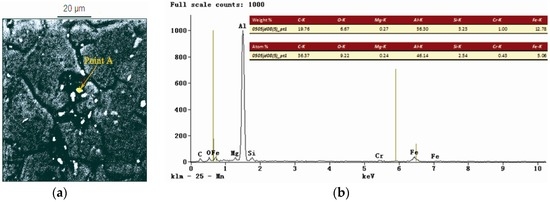 (a) EDS map of the HAZ of the specimen treated with LSP assisted by DSA; (b) corresponding point EDS analysis marked by arrow A in Figure 4a.
