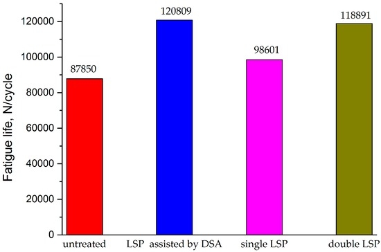 Figure 5 shows the histogram of the high-cyclic load fatigue life of the AA6061-T6 welded joints after different LSP processes. As can be seen, the specimen which was not treated with LSP showed the shortest fatigue life (87,850 cycles), while the longest fatigue life was found in the specimen treated using LSP assisted by DSA, reaching 120,809 cycles, some 1.4 times that of the specimen not treated with LSP. In addition, the specimen treated once with LSP at room temperature presented a longer fatigue life (98,601 cycles) than that of the specimen not treated with LSP. The fatigue life (118,891 cycles) of the specimen treated twice with LSP at room temperature was further improved compared with that treated once, while it was slightly shorter than that of the specimen treated using LSP assisted by DSA. This is because the high-density dislocation induced by LSP assisted by DSA and the release rate of the residual compressive stress were decreased. Owing to this combined effect, the fatigue performance of the Al alloy welded joints was significantly enhanced, thus exhibiting a far superior strengthening effect to those obtained in single and double LSP at room temperature.