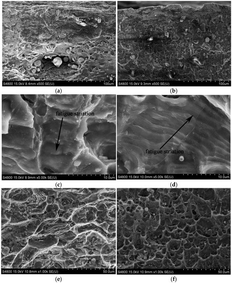 Figure 7 indicates the microstructures of the fatigue fractures of the welded joints before and after LSP treatment assisted by DSA. A large number of crack sources can be found in the fatigue fractures on the surface of the welded joints in untreated specimens, as shown in Figure 7a. After treatment, no crack sources were found on the fracture surfaces and there were few fatigue crack sources on the secondary surfaces (Figure 7b). This is because compact strengthened layers, together with residual compressive stress, were formed on the surface of the specimens in LSP assisted by DSA. Due to this, fatigue crack sources were generated in a downwards direction in the welded defects on the secondary surface instead of from the surface layers. Therefore, fatigue cracks were initiated, thus improving the fatigue life of the specimens. Obvious fatigue strips were found in the crack extension region on the fracture surface of untreated specimens, with their spacing being over 2 μm (Figure 7c). In addition, the crack extension region on the fracture surface of the specimen treated using LSP assisted by DSA was also observed with fine fatigue strips at a separation of 1 μm (Figure 7d). According to the small distance between fatigue strips, it can be inferred that the fatigue cracks on the welded joints extended at a slow rate after the joints were treated using LSP assisted by DSA. Based on Figure 7e, the dimples in the transient zone of fatigue fracture cracks were relatively sparse, while those dimples in the specimen after LSP assisted by DSA (Figure 7f) were deeper and larger, and were distributed densely and uniformly. The larger and deeper the dimples under the same fracture conditions, the better the plasticity of the material. This indicated that LSP improved the plasticity of the transient zone of the specimens. This improvement meant that the generation and extension of cracks slowed down, thus postponing the occurrence time of fatigue fracture. This is conducive to increasing the fatigue performance.