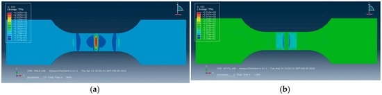Next, pressure loads were applied according to the Fabbro model so as to simulate LSP [29,30]. The simulated residual stress in untreated welded joints is illustrated in Figure 9a. As can be seen, residual tensile stresses were found in the weld beads and the HAZs, and the maximum tensile stress (300 MPa) was found in the center of the cracks. It quickly declined from the weld beads to the HAZs on both sides of the weld beads and tended toward zero on the edge of the HAZs, that is, at a position 6 mm from the weld center. Figure 9b displays the residual stress fields acquired at the working temperature of 130 °C and it was found that residual compressive stress was discovered in the weld beads and the HAZs (LSP region), and the maximal compressive stress was in the weld bond, reaching −192 MPa. According to the comparison of the numerical simulation with the experimental results, the same trend in residual stress was discovered, as shown in Figure 8; however, the tested residual stresses were generally smaller than simulated results due to following reasons: